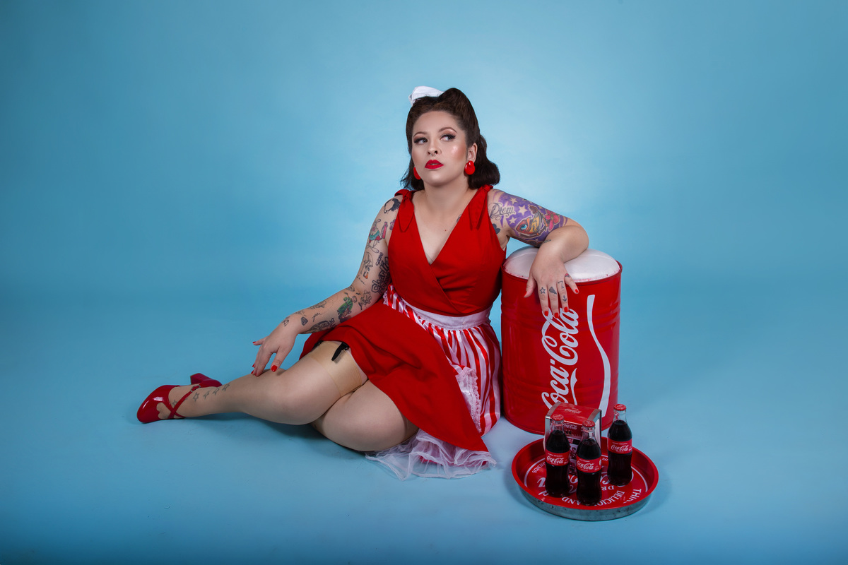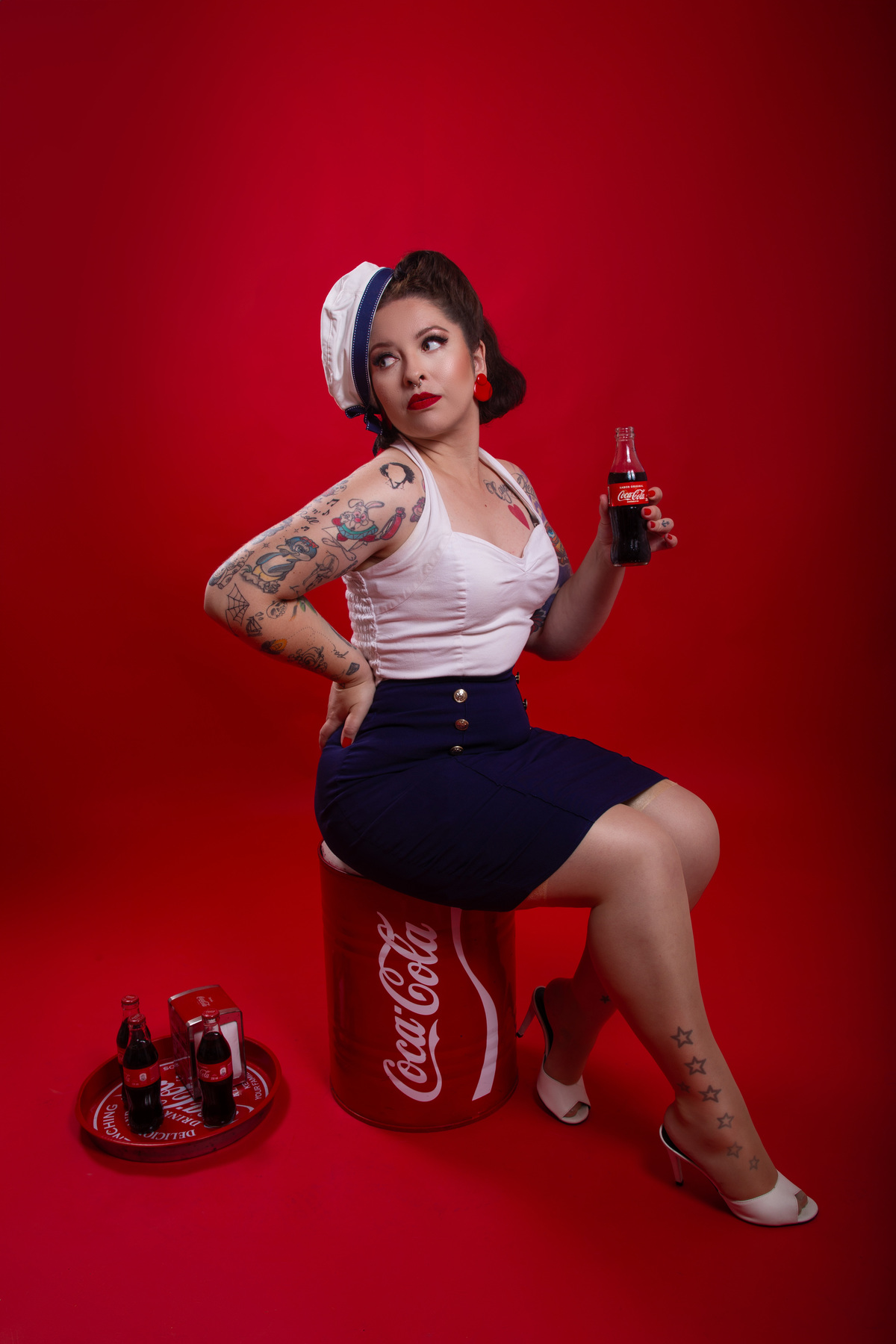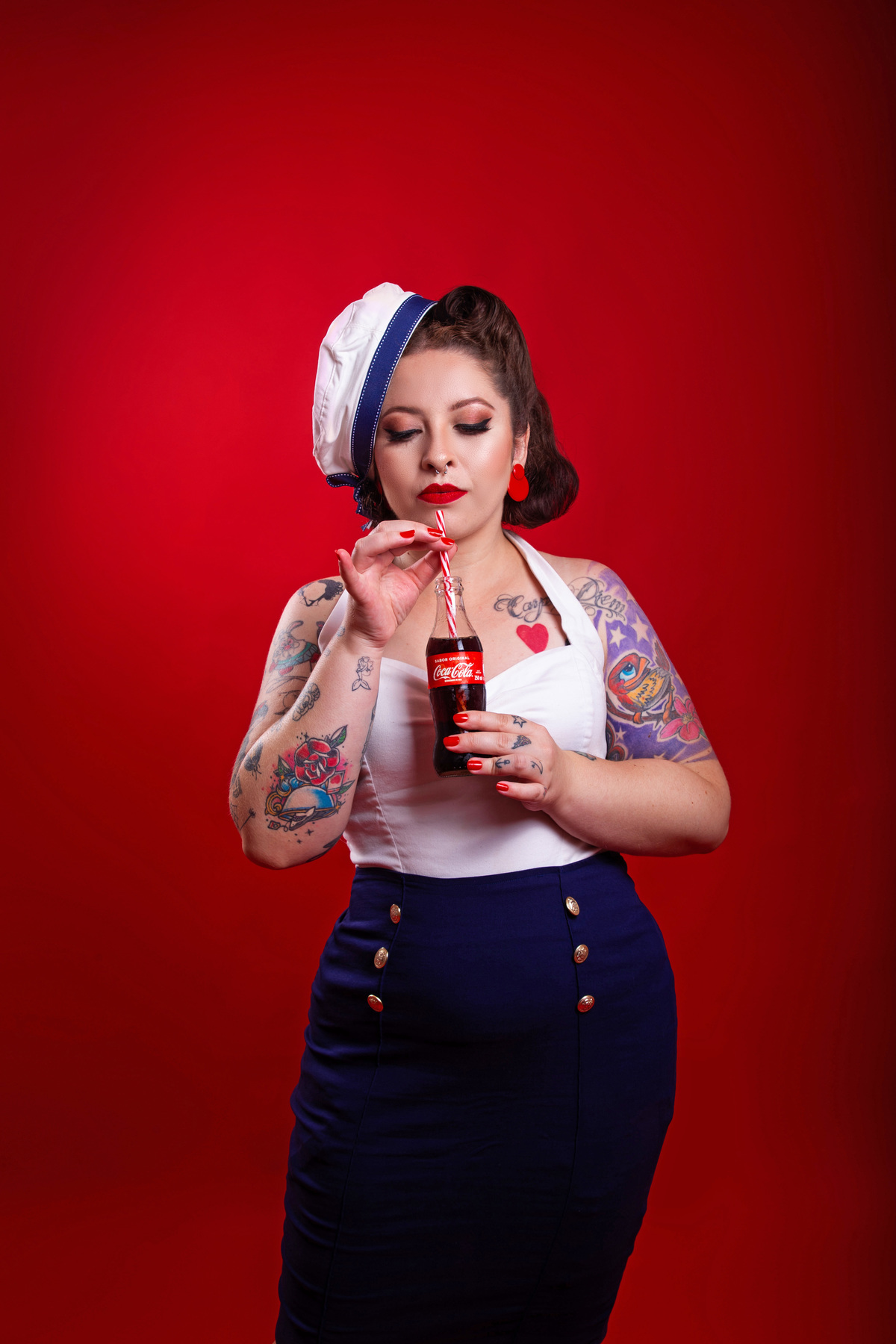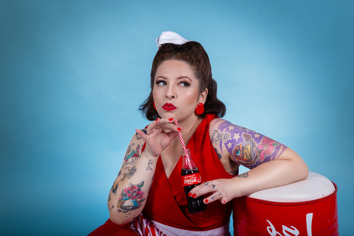 Ensaio inspirado na coca-cola para Mariana, que optou por um vestido vermelho Gessica Rouse & Acessórios de lanchonete! No 2o figurino, usamos um look nautico, inspirado nas propagandas antigas da Coca-cola.